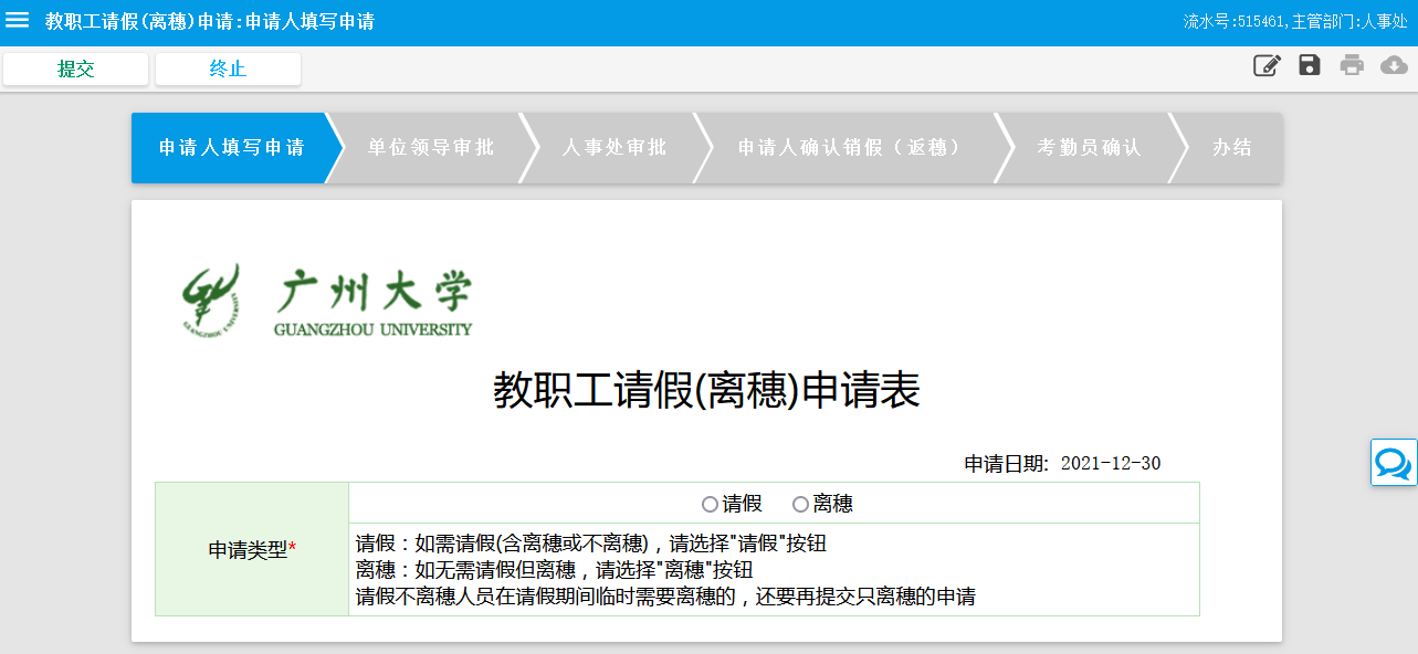 1. PC端:登录“数字广大”进入融合门户,点击右上角推荐服务中的“服务中心”,点击“全部事项”→点击“人事处”→选择“教职工请假(离穗)申请”发起流程。